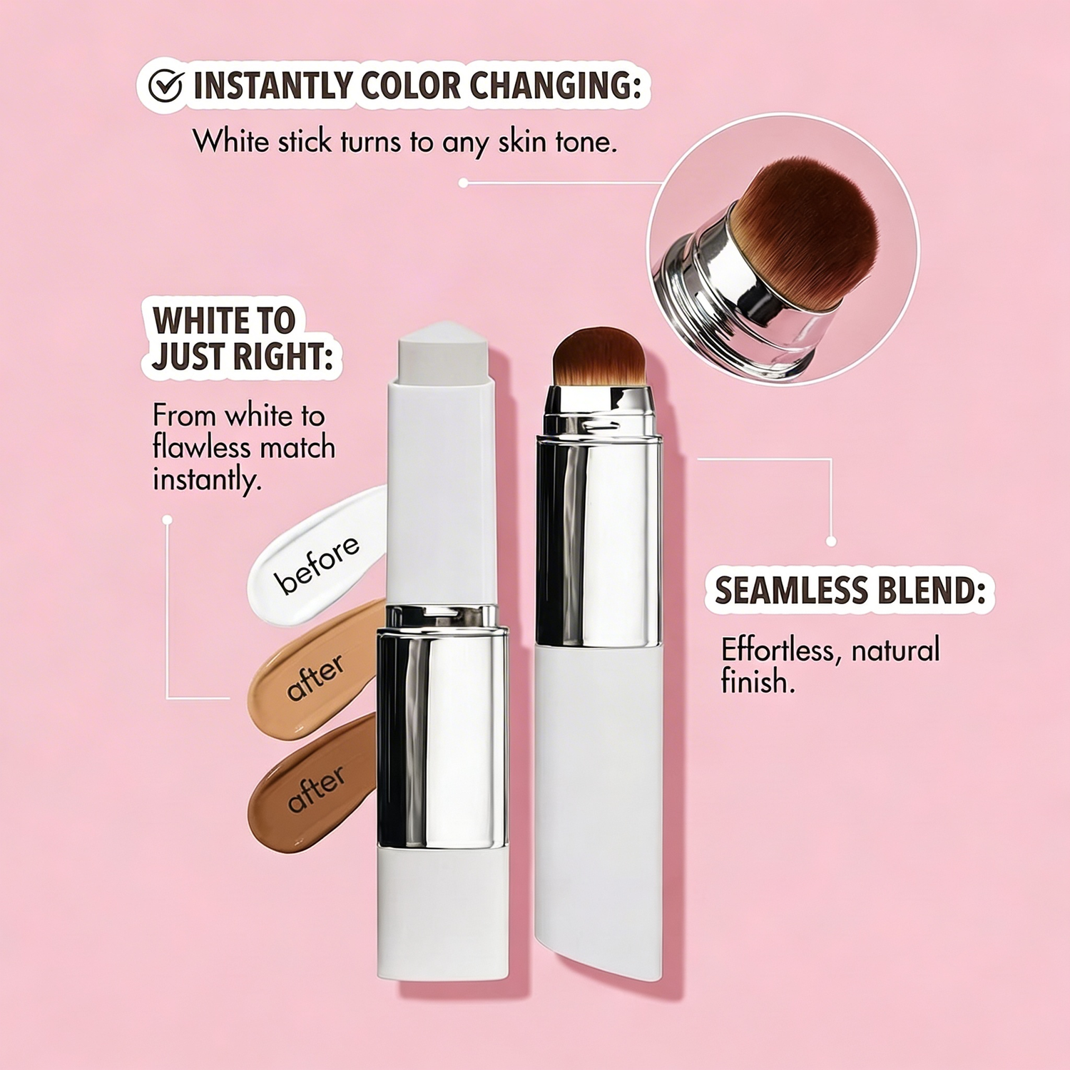 We created a universal color-changing foundation for women who are tired of struggling to find their perfect shade. The Color Changing Foundation Stick's innovative formula magically adapts and blends seamlessly with every skin tone. From the fairest to the deepest, delivering a flawless, natural-looking match every single time. 😊